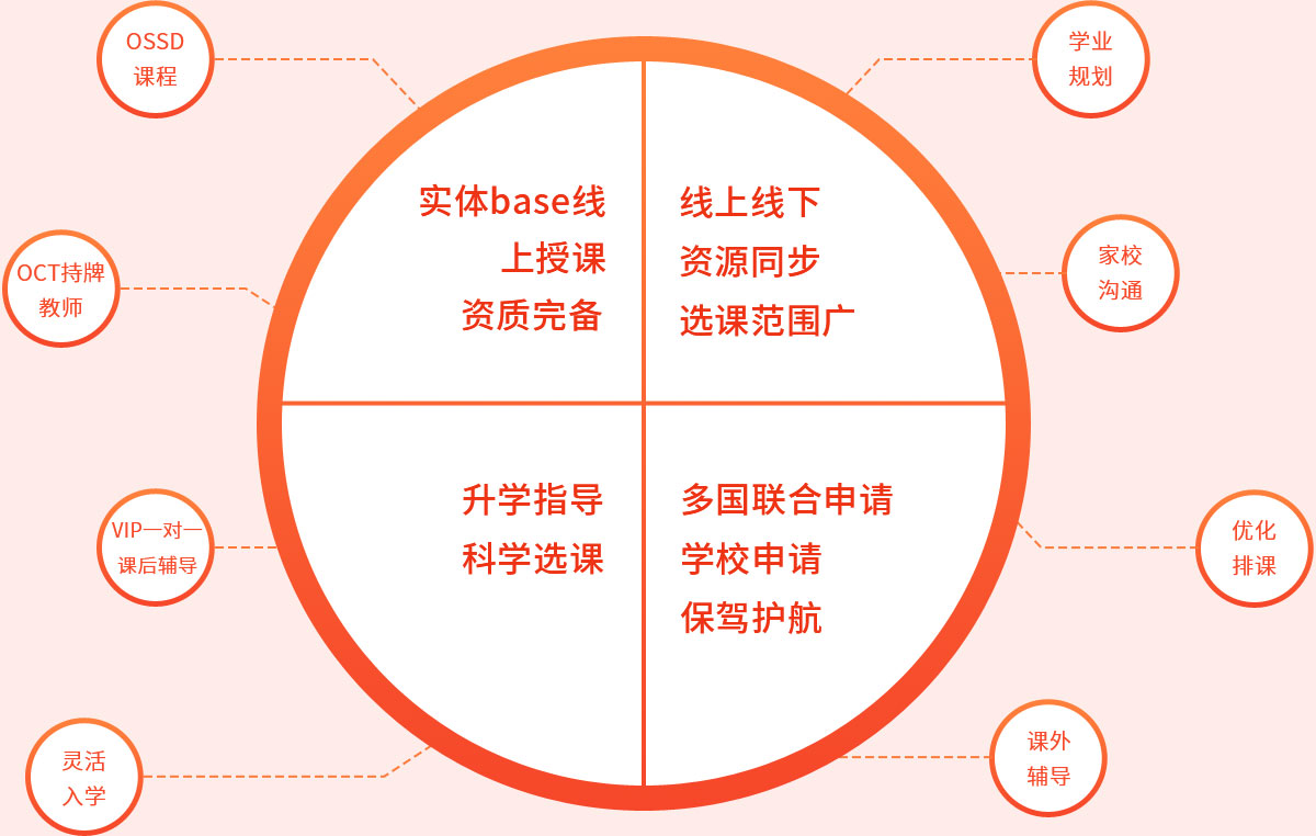 严格按照安省教育部每门课程110学时的要求授课:所有课程均由外教直播授课,全部持有OCT执照;加拿大实体中学,免费注册加拿大安省学籍,下发学校正式offer;中外籍教师VIP一对一课程辅导(110学时之外);免费赠送ESL课程,多方面提升学生基础到高阶的英语水平;学科护航课程,专项突破学科重难点知识;每周至少2次家校通汇报,及时发现问题及时解决